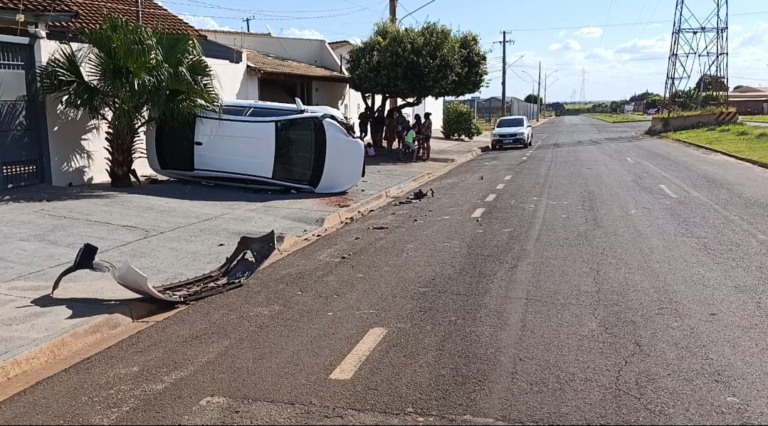 Ao tentar desviar da motocicleta, o motorista do carro perdeu o controle da direção, colidiu contra o portão do imóvel, atingiu o muro da residência vizinha e acabou tombando sobre a calçada. Com o impacto, uma lixeira foi destruída, além de danos significativos ao portão da casa.