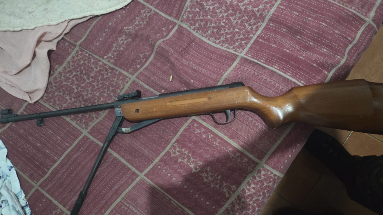 Durante as buscas na residência, os investigadores encontraram uma espingarda adaptada para calibre .22, com uma cápsula já deflagrada, guardada no guarda-roupa do suspeito. A arma foi apreendida e será analisada pela perícia.
