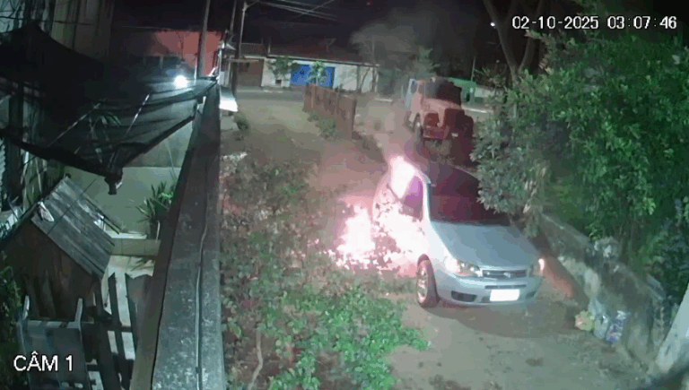 Câmeras de segurança flagraram a cena do crime. As imagens mostram o momento em que um dos homens arremessa uma pedra contra o carro e, em seguida, utiliza uma garrafa com líquido inflamável para provocar o incêndio.