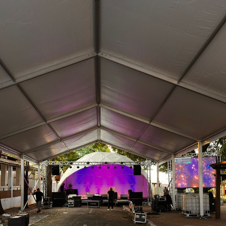 “Aqui é o primeiro evento do Estado sem banheiro químico. Também trouxemos as tendas Euro, lançamento nacional, com vãos de até 30 metros sem pilar, e o piso Easyfloor para cobrir grandes áreas. É uma infraestrutura para atender bem e dar conforto ao público”, disse Leonardo.