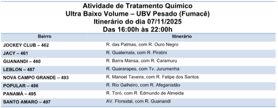 As equipes da Coordenadoria de Controle de Endemias Vetoriais (CCEV) da Secretaria Municipal de Saúde (Sesau) irão circular entre as 16h ás 22h. Pelas ruas dos seguintes bairros: Jockey Club, Vila Jacy, Guanandi, Jardim Leblon, Nova Campo Grande, Vila Popular, Jardim Panamá e Santo Amaro.