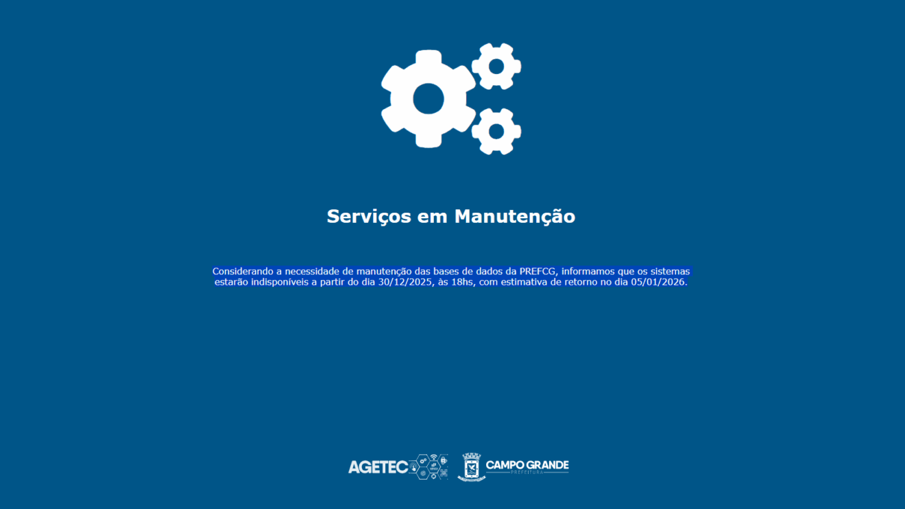 No site, um aviso informa que, “considerando a necessidade de manutenção das bases de dados da Prefeitura de Campo Grande, os sistemas estarão indisponíveis a partir do dia 30 de dezembro de 2025, às 18h, com estimativa de retorno em 5 de janeiro de 2026”.