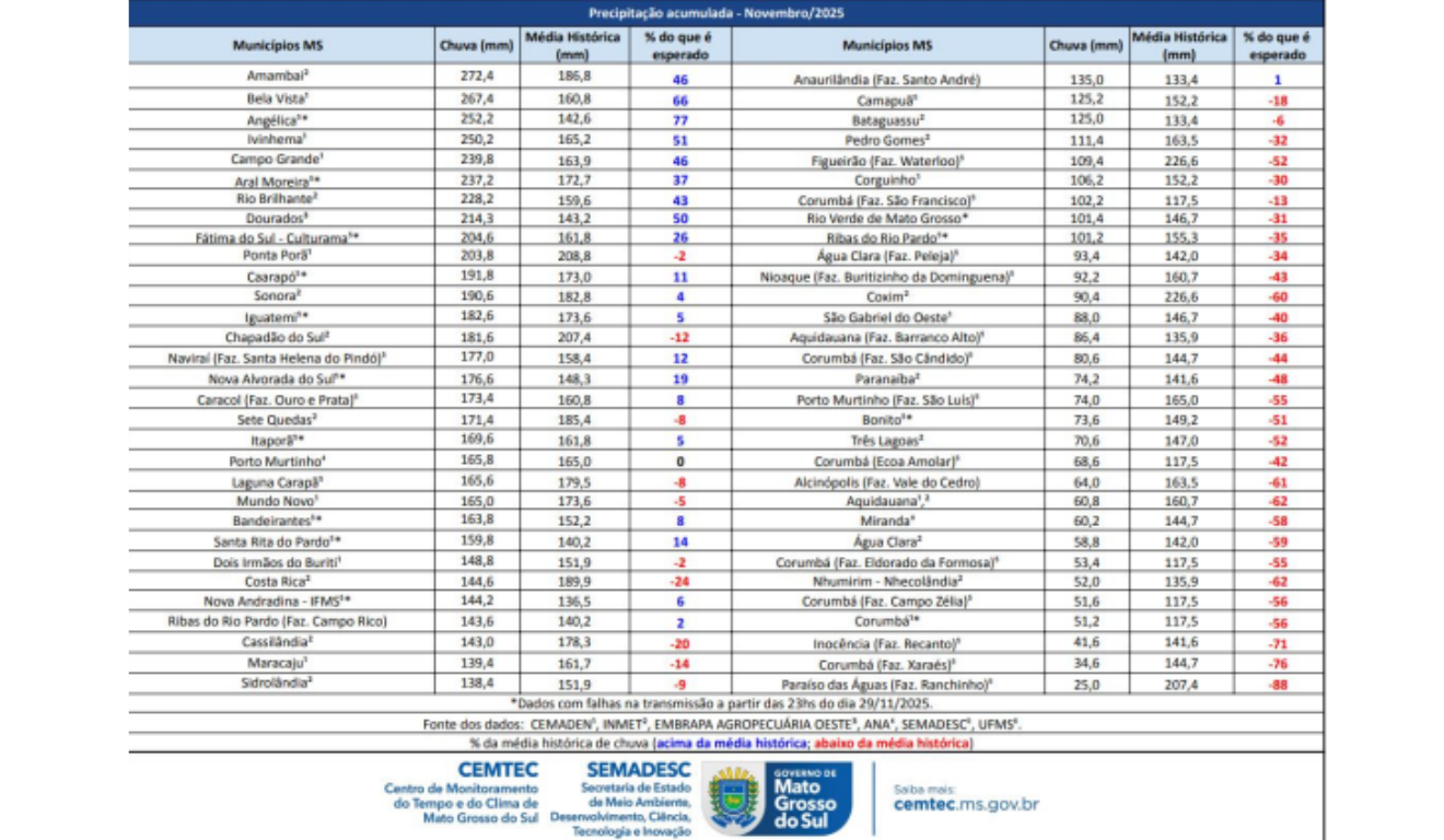 Em Campo Grande, a chuva acumulada em novembro ficou 5% acima da média histórica, segundo dados do Instituto Nacional de Meteorologia (Inmet). Em outro ponto de medição oficial, do Centro Nacional de Monitoramento e Alertas de Desastres Naturais (Cemaden), o acumulado chegou a 239,8 milímetros, valor 46% acima do esperado para o mês.