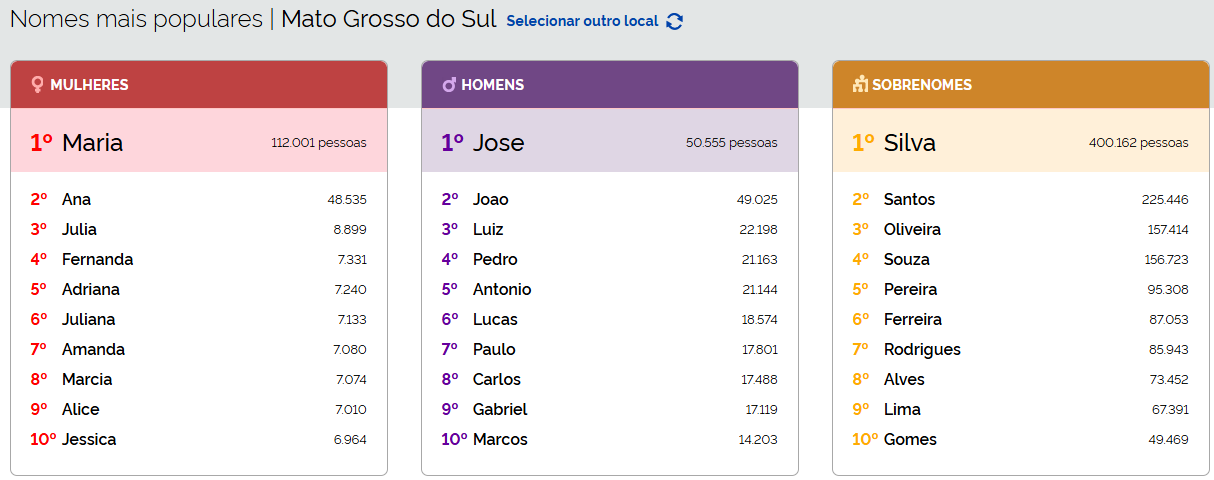 O sobrenome Silva é o mais frequente entre os sul-mato-grossenses, identificado em 400 mil pessoas, seguido de Santos (225 mil) e Oliveira (157 mil).