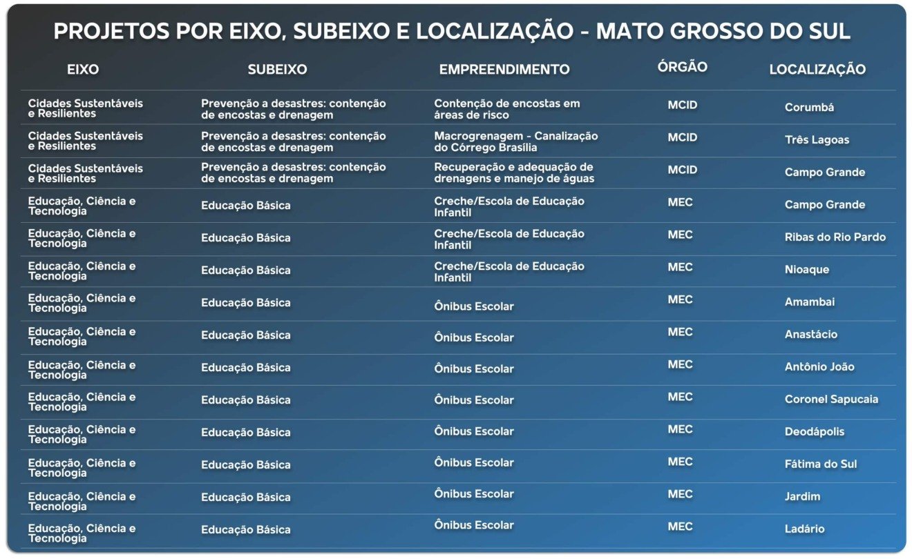 No eixo Educação, Ciência e Tecnologia, a previsão inclui creches e escolas de educação infantil em Campo Grande, Ribas do Rio Pardo e Nioaque.