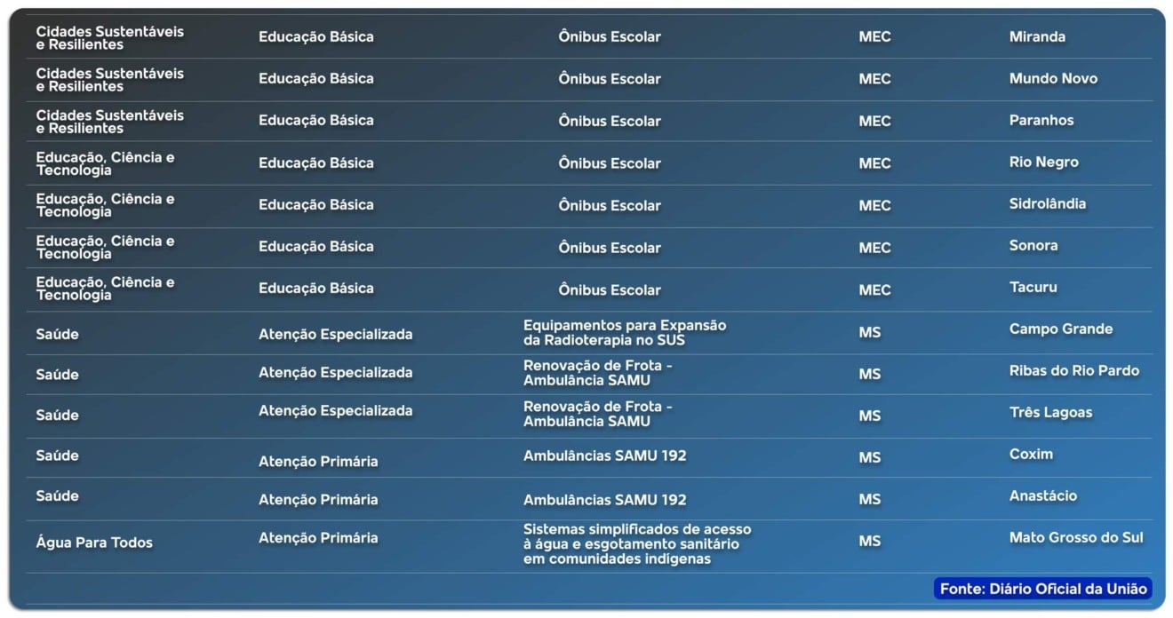 Para o transporte: Amambai, Antônio João, Coronel Sapucaia, Deodápolis, Fátima do Sul, Jardim, Ladário, Miranda, Mundo Novo, Paranhos, Rio Negro, Sidrolândia, Sonora e Tacuru — serão contemplados com ônibus escolares. Isso tende a reduzir evasão e deslocamentos inseguros de estudantes.