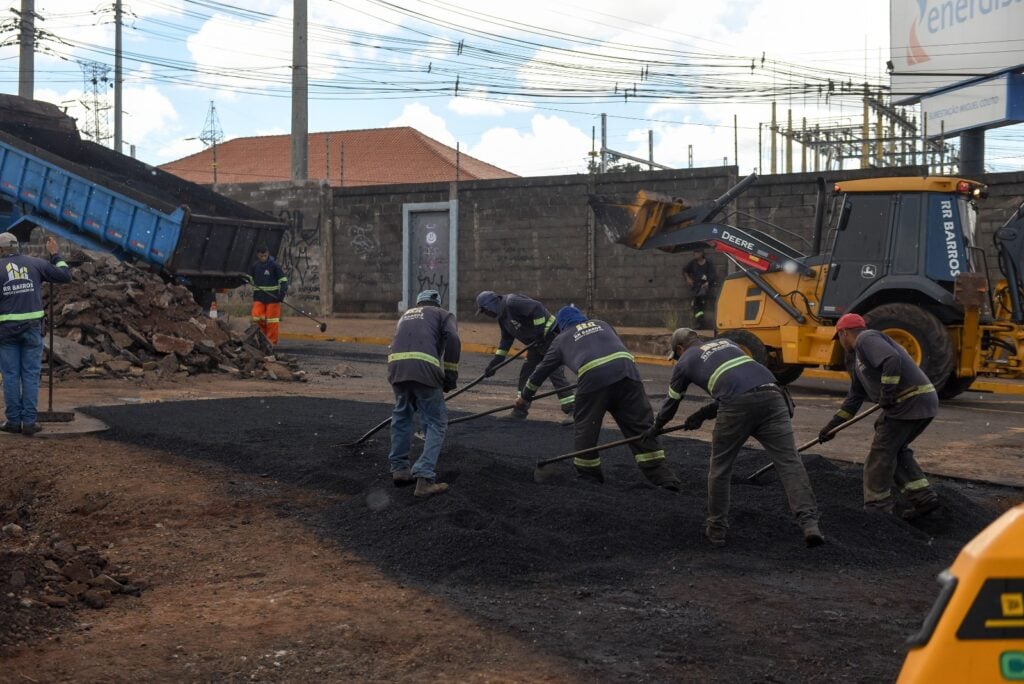 Na rotatória que interliga a Avenida Eduardo Elias Zahran à Rua Joaquim Murtinho, os trabalhos foram emergenciais. As chuvas recentes comprometeram a estrutura de um poço de visita (bueiro), danificando o asfalto.