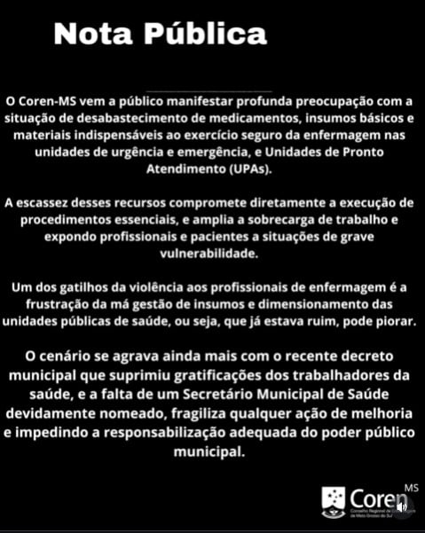 O Conselho Regional de Enfermagem de Mato Grosso do Sul (Coren-MS) divulgou Nota Pública que alerta a gravidade da situação e cobra providências urgentes da Prefeitura de Campo Grande. O órgão destaca que a má gestão de insumos, aliada ao dimensionamento inadequado das equipes, aprofunda a crise e expõe profissionais e usuários a riscos evitáveis.
