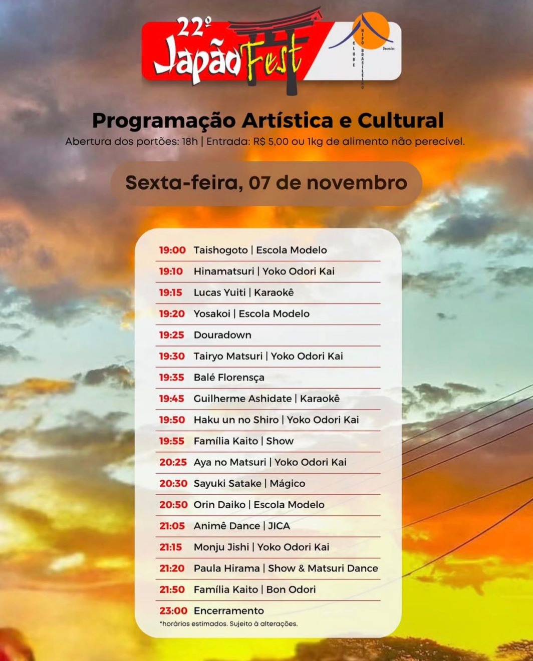 A programação da 22º edição do Japão Fest começa na sexta-feira (7) em Dourados. Tradicional evento da cidade, o encontro é uma festa, que celebra a cultura japonesa com uma programação especial que inclui apresentações artísticas e culturais, a dança tradicional Bon Odori, exposições e a deliciosa gastronomia típica (sushi, lámen, entre outros).