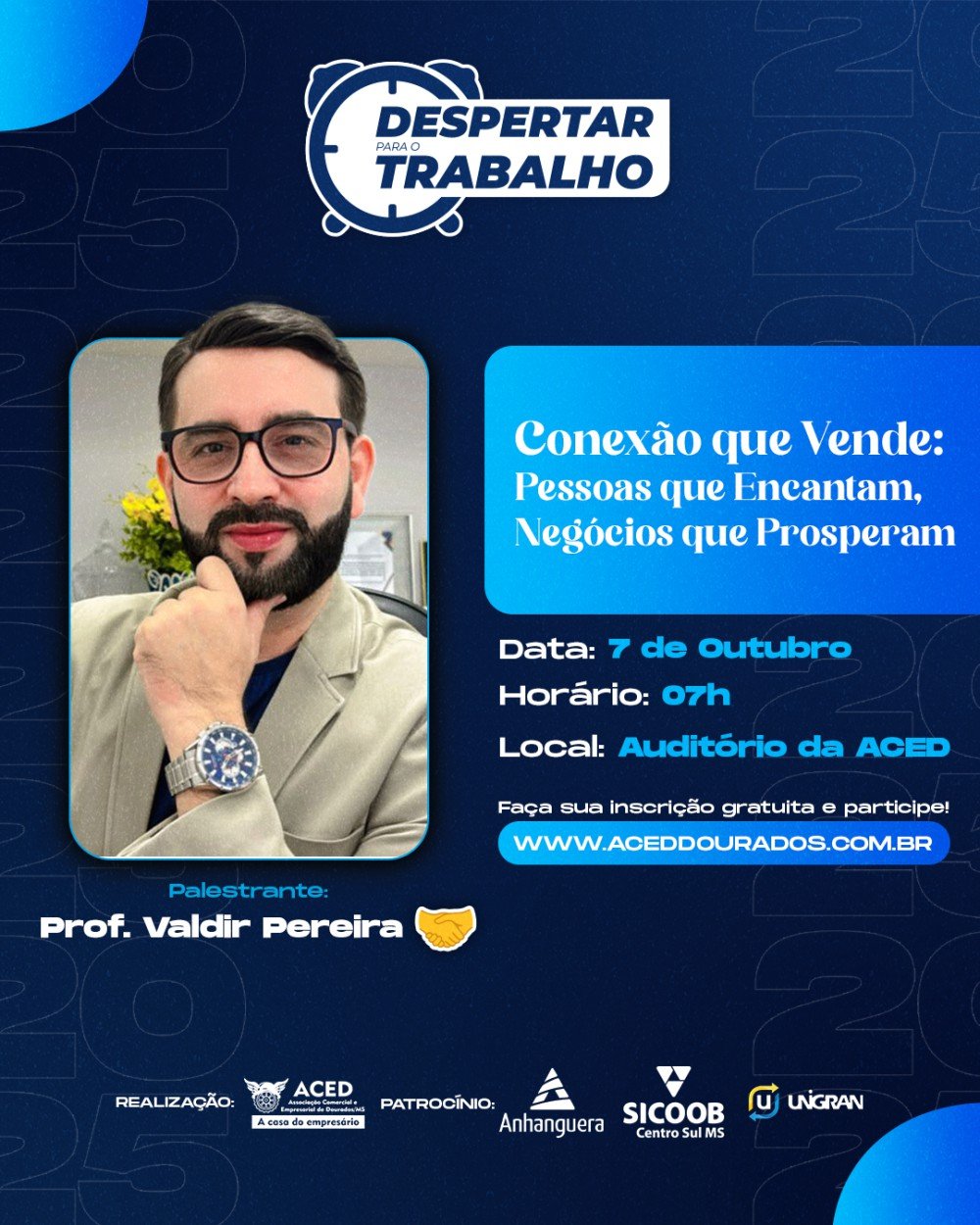 A Associação Comercial e Empresarial de Dourados (ACED) promove no dia 7 de outubro mais uma edição do programa “Despertar para o Trabalho”, com a palestra “Conexão que Vende: Pessoas que Encantam, Negócios que Prosperam”, ministrada pelo professor Valdir Pereira.