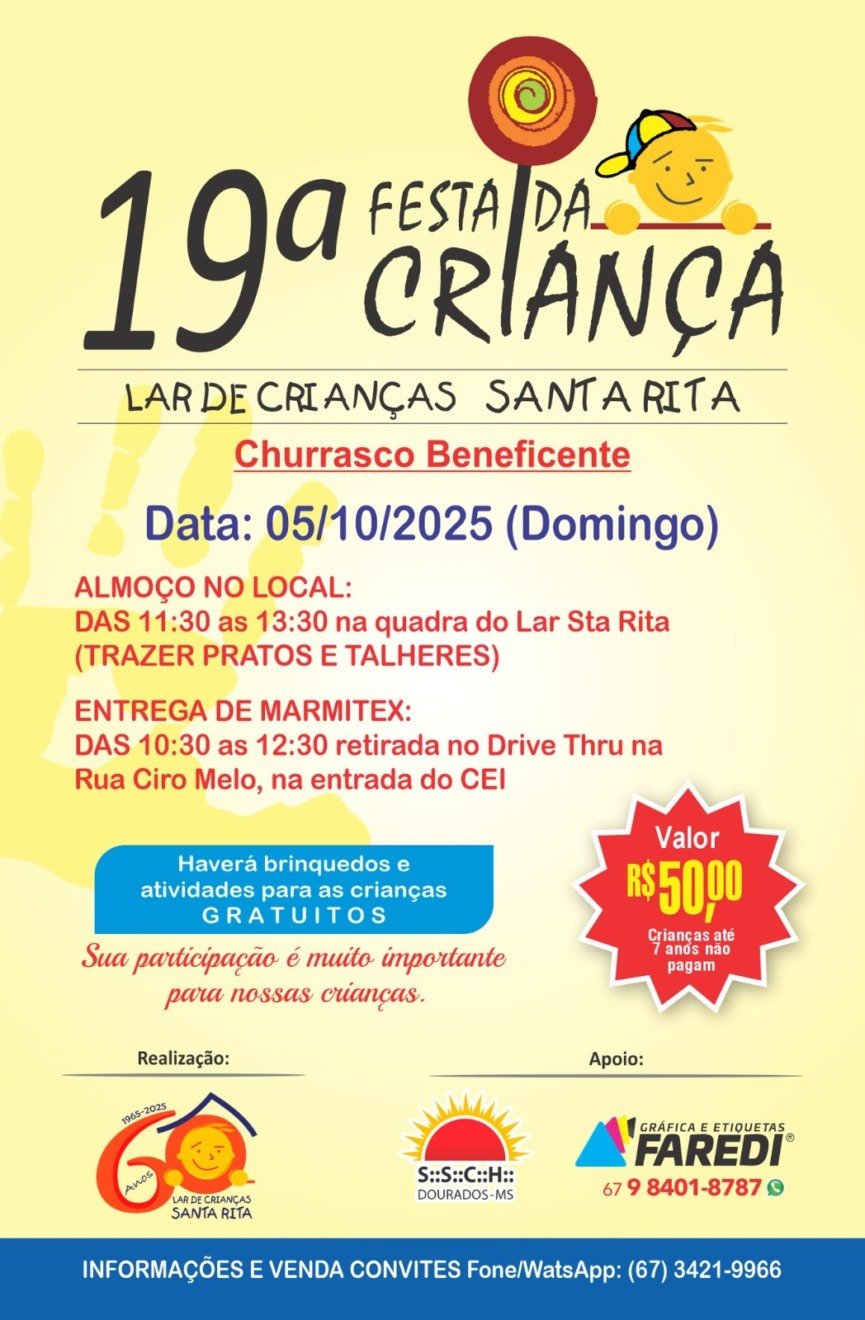 Com 60 anos de atuação em Dourados, o Lar Santa Rita desenvolve diversas promoções para ajudar no custeio das ações. Um dos principais é o Churras Beneficente. “A gente tem que ter recursos financeiros para gerir o lar. Atualmente temos um tipo de convênio, alguns recursos de emendas, mas nem sempre é suficiente. Então a gente precisa realizar várias promoções, como a festa junina, por exemplo, mas o nosso evento principal durante o ano é a Festa da Criança, que é um delicioso churrasco”, conta.