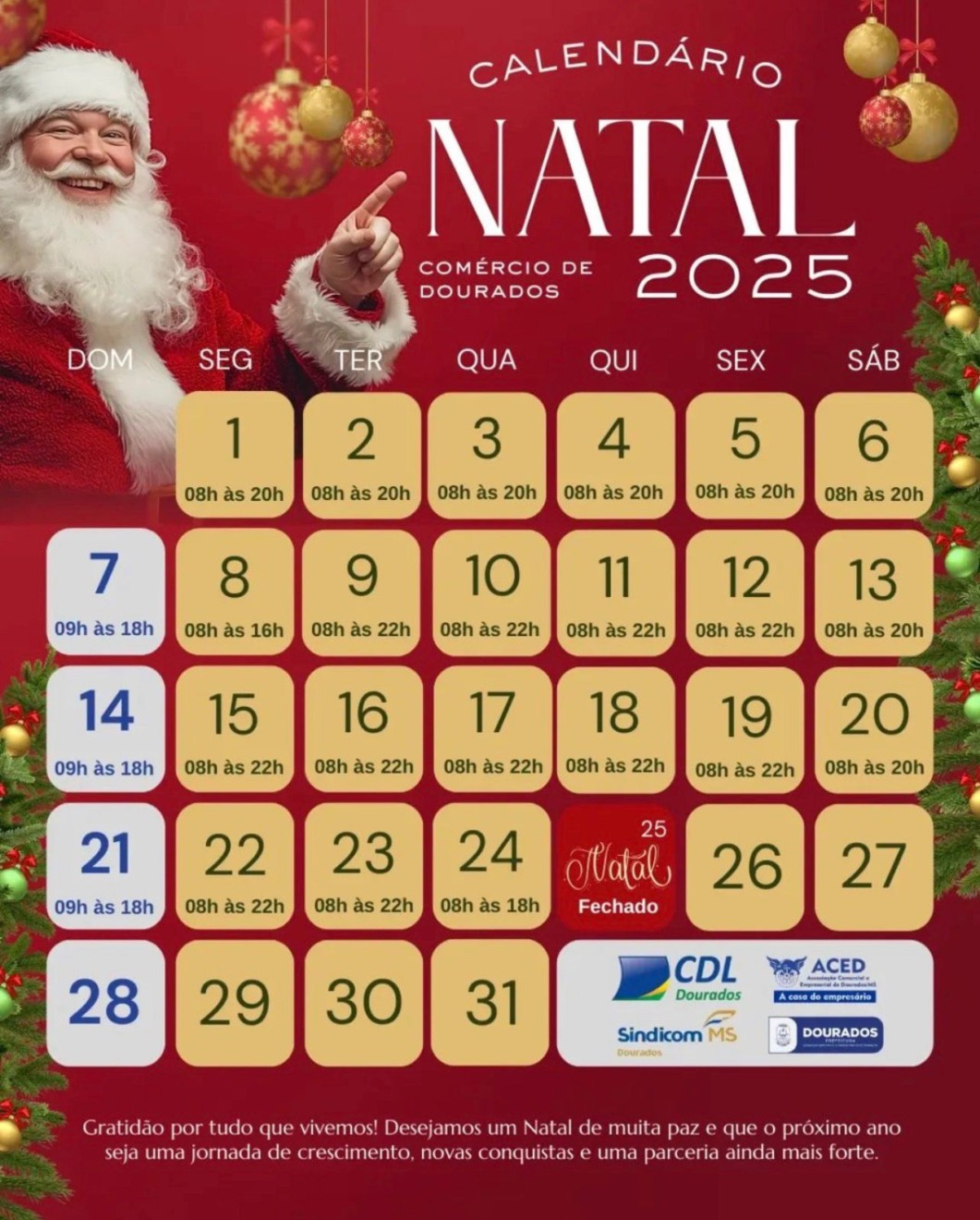 Somados os gastos com compras e comemorações natalinas devem chegar a R$ 42,39 milhões, de acordo com a expectativa projetada pelo IPF-MS e Sebrae. Somados, Natal e Ano Novo devem alcançar mais de R$ 75 milhões girando na economia douradense.