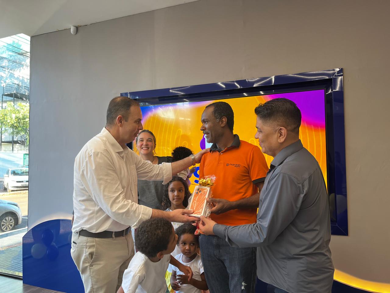 “Eu tenho um sócio, o Daniel e ele viu uma postagem de um amigo nosso nas redes sociais aqui na frente da Massa para concorrer ao Iphone, aí ele me falou, passa lá com a camisa da corretora que é laranja e vai combinar com o Iphone laranja. Ele é tímido, então eu falei, vou fazer. E estava com a família aqui na frente, no Erasmo e passando, falei com a minha esposa e viemos fazer a foto e graças a Deus fomos contemplados”, destaca.