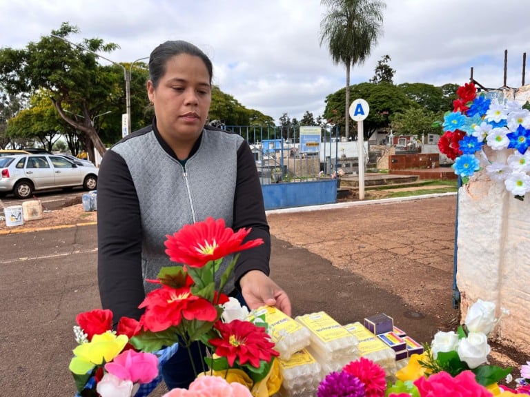 A data também é uma oportunidade de geração de renda para centenas de vendedores ambulantes, que tradicionalmente comercializam flores, velas e demais artigos para homenagens aos entes que já partiram. Elaine Galeano Rodrigues, 27 anos, trabalha com o comércio de finados há mais de 13 anos e fala da expectativa para esse ano.