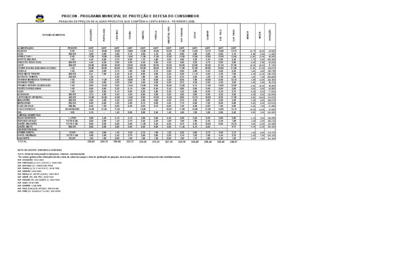 O Procon realizou o levantamento de preços entre os dias 3 e 5 de fevereiro de 2026 com os produtos que compõem a cesta básica em 12 supermercados do município. Foram analisados 29 itens previamente definidos, com o objetivo de orientar o consumidor e promover maior transparência nas relações de consumo.