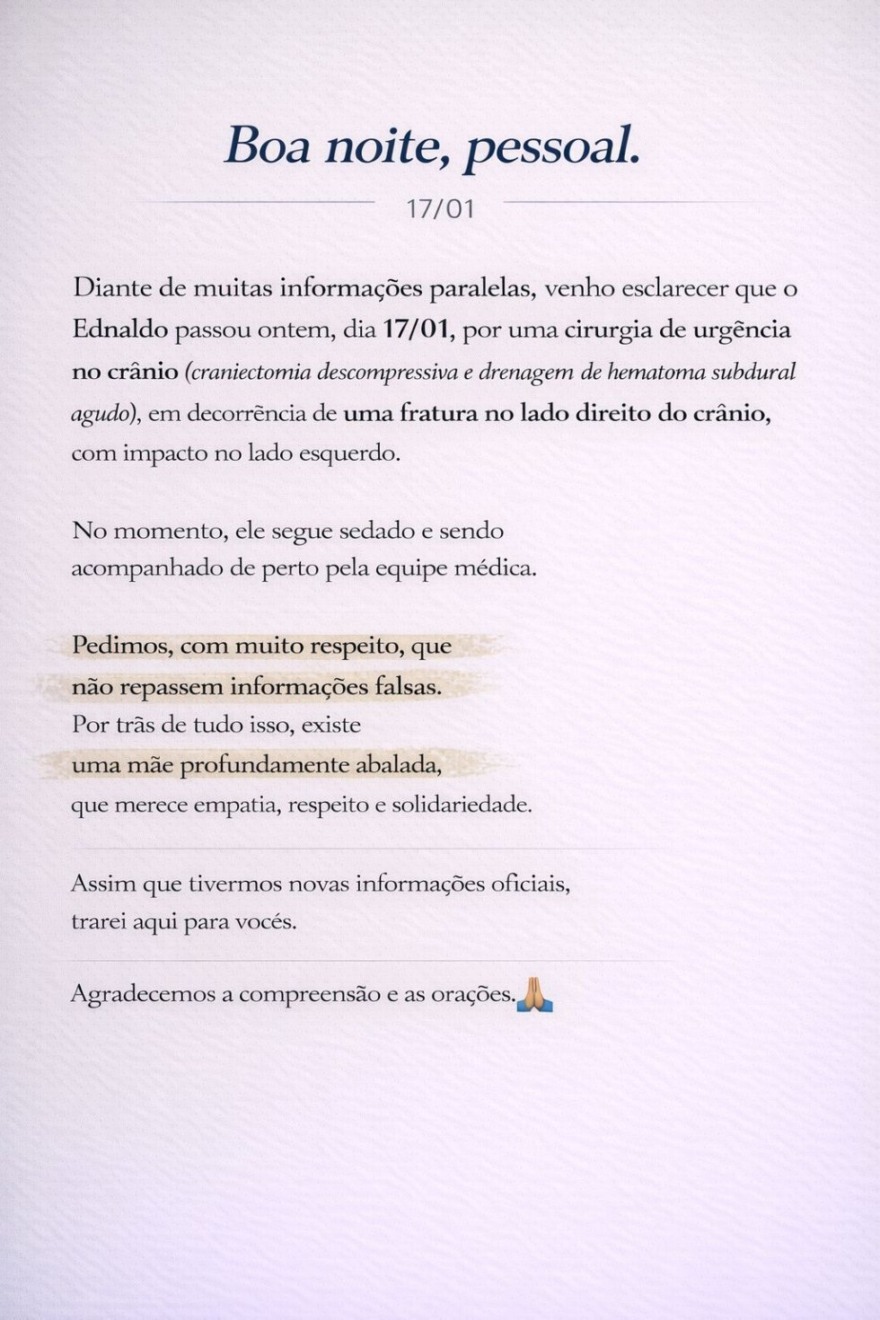 A família da vítima, segundo o site Deodápolis News, também divulgou uma nota atualizando o estado de saúde do servidor no domingo à noite. Confira: