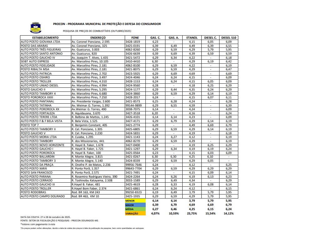 O preço médio da gasolina comum em Dourados, em outubro de 2025, é de R$ 6,27, enquanto que em setembro deste ano, o preço médio praticado era de R$ 6,28, apresentando uma queda de 0,15% no preço médio.