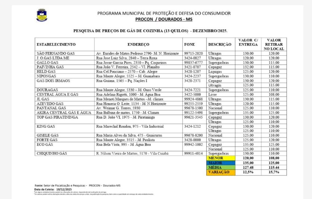 Em Dourados, o preço médio do gás de cozinha botijão 13 quilos, para entrega em domicílio, é de R$ 127,48, valor 7,73% a mais que em fevereiro de 2024, quando o valor médio de venda do gás em Dourados era R$118,33. A informação foi divulgada pelo setor de fiscalização do Procon, que realizou esta semana uma pesquisa de preços de gás de cozinha. Foram pesquisados 19 estabelecimentos na cidade.