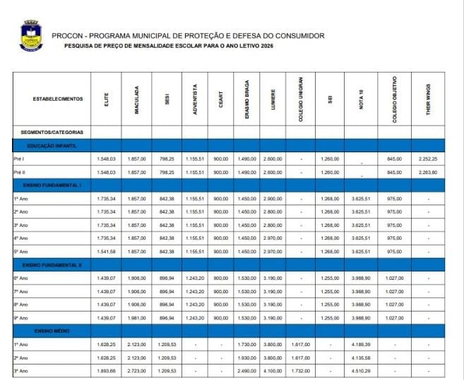 A pesquisa dos valores das mensalidades escolares para o ano letivo de 2026 foi feita em doze instituições de ensino da cidade, entre os dias 1º e 11 de novembro.