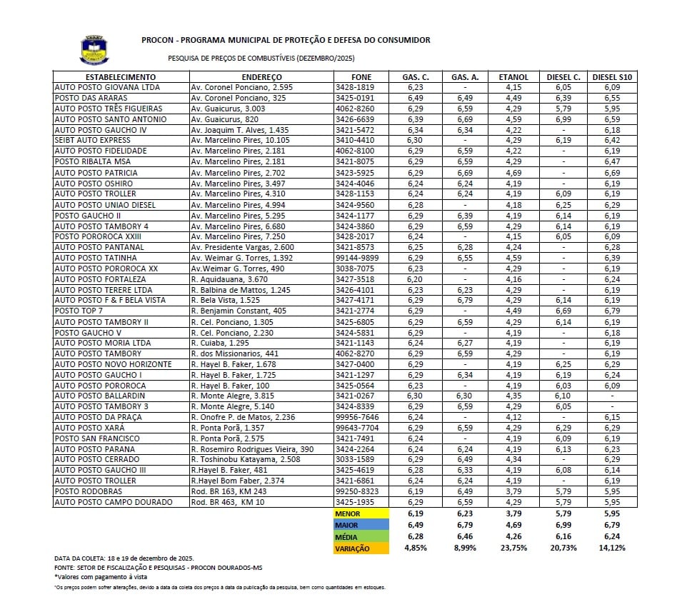 O preço médio da gasolina comum em Dourados, em dezembro de 2025, é de R$ 6,28, e, em novembro deste ano, o preço médio praticado era de R$ 6,27, apresentado um aumento de 0,15% no preço médio.