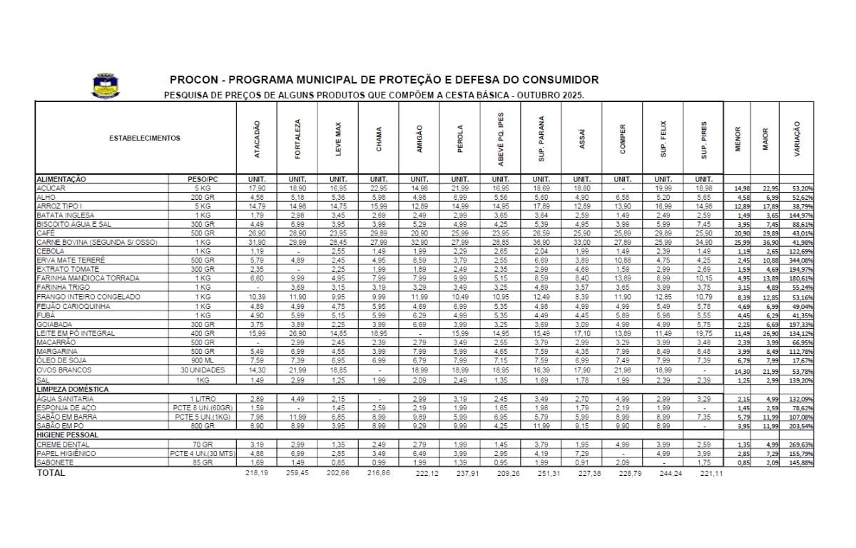 O Programa Municipal de Proteção e Defesa do Consumidor (Procon) divulgou uma pesquisa que aponta uma queda de 6,44% no valor médio da Cesta Básica em Dourados. O levantamento foi feito entre os dias 1 e 2 de outubro em 12 supermercados da cidade.