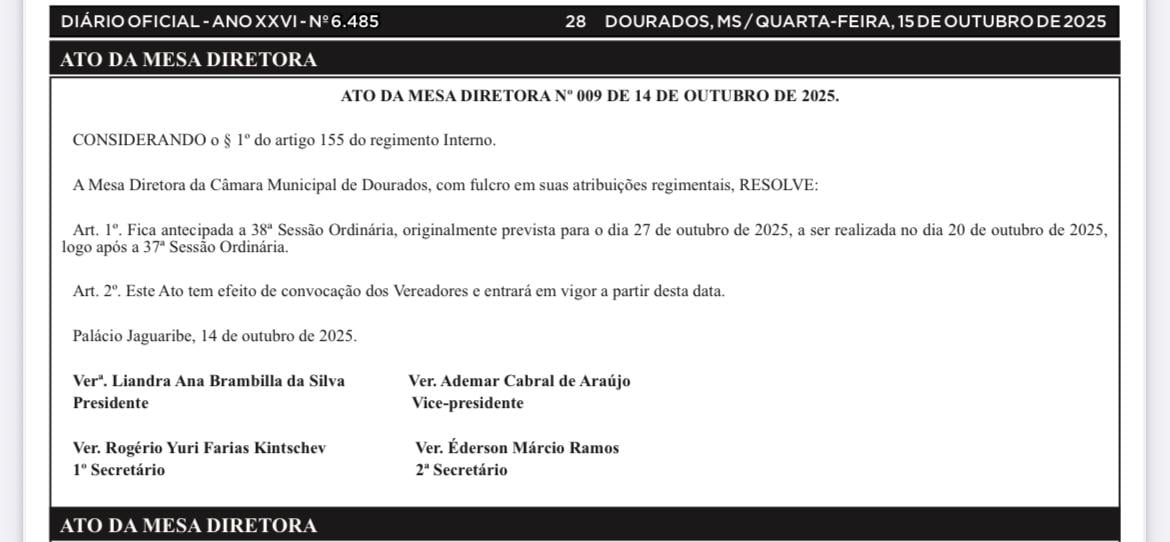 Os vereadores de Dourados vão garantir o ponto facultativo na próxima segunda-feira (27), realizando duas sessões ordinárias hoje, uma às 15h e outra às 17h. A antecipação da sessão prevista para o dia 27 de outubro foi oficializada pela Mesa Diretora em Ato administrativo publicado no Diário Oficial do Município do dia 15 de outubro.
