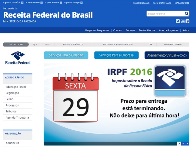 A três dias do fim do prazo, cerca de 10 milhões de contribuintes ainda não entregaram a declaração do Imposto de Renda Pessoa Física 2016. Até as 17h de hoje (62), a Receita Federal havia recebido 18.416.319 declarações. O número equivale a 64,6% das declarações previstas para este ano. A entrega começou em 1º de março e vai até esta sexta-feira (29).