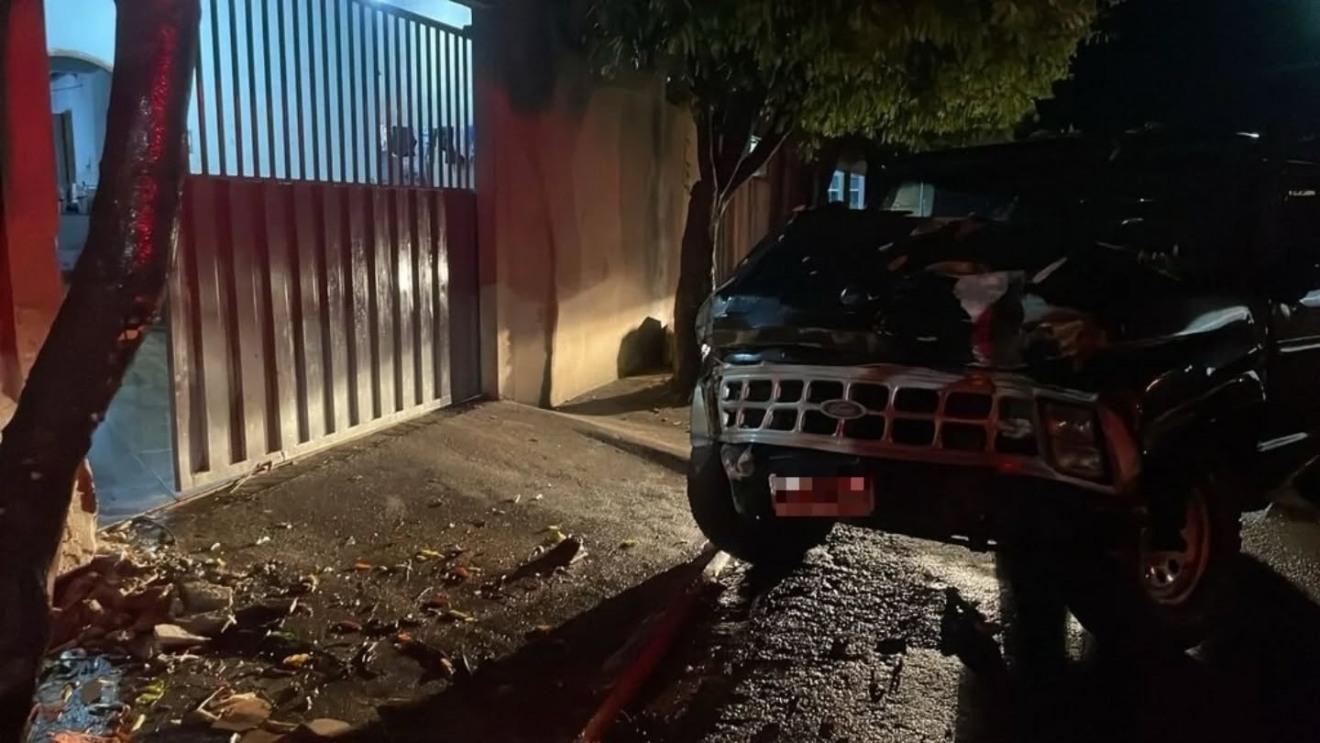 Durante o trajeto, o motorista perdeu o controle da direção e se envolveu em novos impactos. O veículo colidiu contra uma árvore e, em seguida, atingiu o muro e o portão de uma residência, causando danos significativos à estrutura do imóvel. Em razão da violência das batidas, a caminhonete sofreu avarias severas na parte frontal e ficou impossibilitada de continuar em circulação.