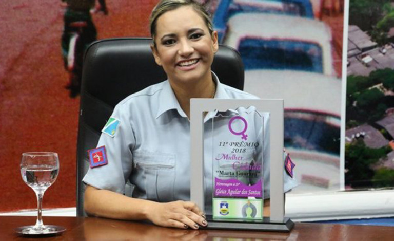 A Câmara de Dourados entregou, durante sessão solene realizada na noite desta segunda-feira (19), o prêmio Mulher Cidadã “Marta Guarani” a aluna Sargento da PM do polo de ensino do 3º BPM em Dourados, Gleice Aguilar dos Santos.
