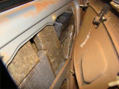 Após vistoria no pátio da Polícia Federal, foram encontrados na lataria do veículo, 37 tabletes com embalagem transparente e tamanhos variados, contendo maconha, alojados nas laterais traseiras e na tampa do porta-malas, totalizando cerca de 25 kg.