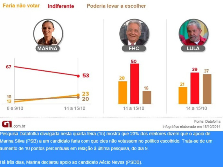 Pesquisa Datafolha divulgada nesta quarta-feira, dia 15, mostra que 23% dos eleitores dizem que o apoio de Marina Silva (PSB) a um candidato faria com que eles não votassem no político escolhido. Trata-se de um aumento de 10 pontos percentuais em relação à última pesquisa, do dia 9.