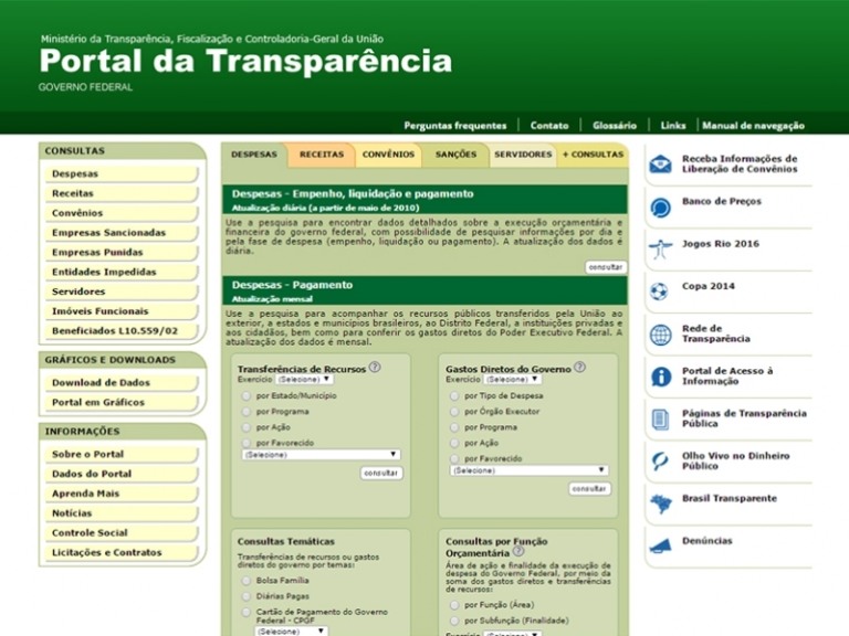 O número de acessos ao Portal da Transparência do governo federal bateu recorde histórico. Em outubro, o site recebeu 2.229.022 visitas, maior número para o mês, desde seu lançamento, em novembro de 2004. No acumulado parcial de 2016, o resultado já supera a média de anos anteriores. De janeiro a novembro, a página recebeu 16,6 milhões de visualizações. A área mais acessada é a de “Despesas Diárias”, com 50% de aumento nos acessos. Os estados de São Paulo, do Rio de Janeiro, de Minas Gerais e do Rio Grande do Sul lideram as consultas ao portal.