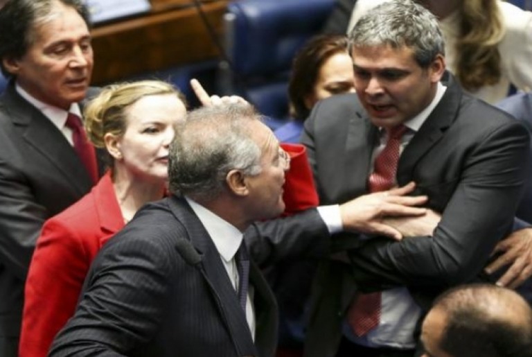 Gleisi foi em direção a Renan afirmando ser mentira, apoiada pelo senador Lindbergh que gritava "baixaria" e que acabou sendo empurrado por Renan.