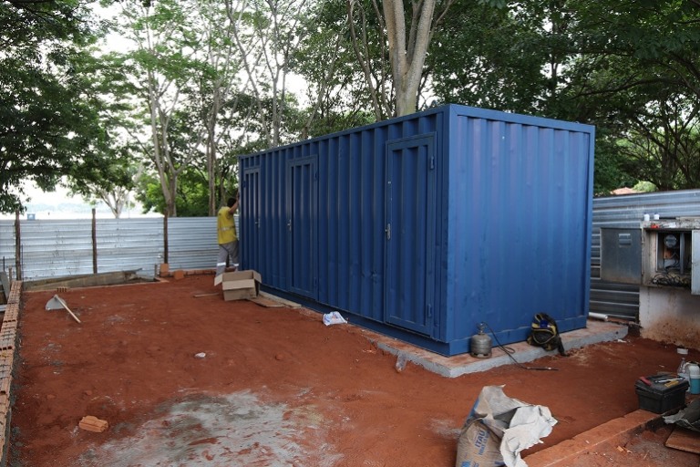 A próxima etapa será a de revestimento externo e acabamento. A escolha por containêr foi por ser uma estrutura de aço, moderna, resistente e sustentável, com visual interno semelhante ao de alvenaria.