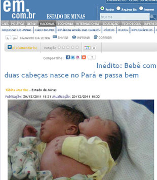 A cidade paraense de Anajás registrou um caso raro no Brasil. Um bebê de duas cabeças nasceu na madrugada de ontem no hospital do município e foi transferido nesta terça-feira (20) para Belém, onde realizará exames. O recém-nascido passa bem e consegue se alimentar normalmente.