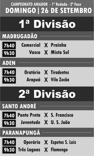 Segunda fase, tudo zerado. Esse é o pensamento das equipes que entram em campo amanhã pelo Campeonato Amador (primeira e segunda divisão). A bola vai rolar com jogos no estádio “Madrugadão”, no campo da Aden (primeira divisão), além das partidas da segundona, que serão disputadas nos bairros Santo André e Paranapungá, sempre com início às 7h40 (Confira os jogos no quadro).