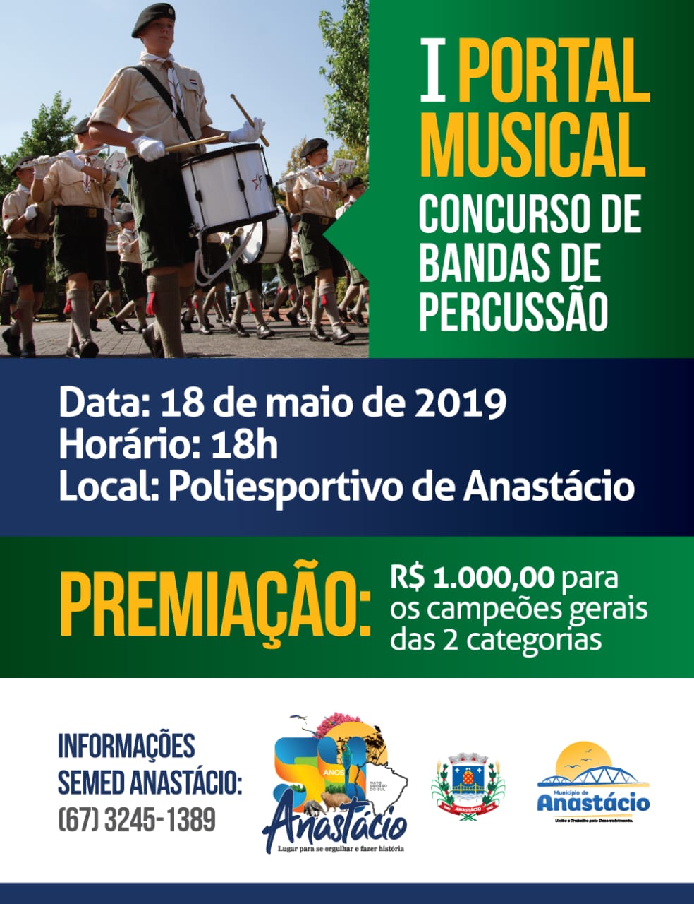 Estão abertas as inscrições para o "1° Portal Musical – Concurso de Bandas de Percussão da Cidade de Anastácio", uma realização da Prefeitura Municipal, por meio da Secretaria Municipal de Educação. Os interessados podem se inscrever até o dia 10 de maio. O grande dia das apresentações está marcado para o dia 18 de Maio, a partir das 18h, no Poliesportivo de Anastácio sito à rua Nilza Ribeiro 102, esquina com Giovani Toscano de Brito.