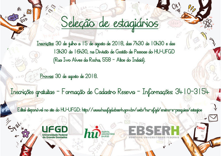 O Hospital Universitário da Universidade Federal da Grande Dourados (HU-UFGD) encerra nesta quarta-feira (15), o período de inscrições para a Seleção Pública de Vagas de Estágio, visando formação de cadastro de reserva, para candidatos de diversos cursos de graduação.