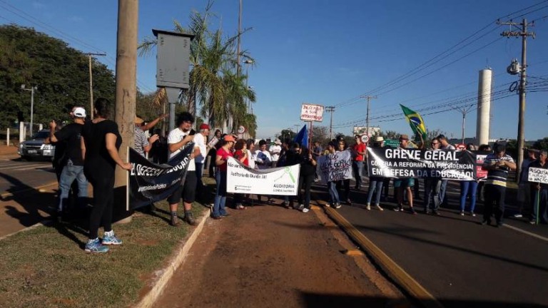 Mais de 100 pessoas estão concentradas em frente à Universidade Federal de Mato Grosso do Sul (UFMS). Com faixas e cartazes, os manifestantes declaram “Greve Geral” nesta sexta alegando que a proposta da reforma representa o “fim da aposentadoria” e de diversos bloqueios na Educação.
