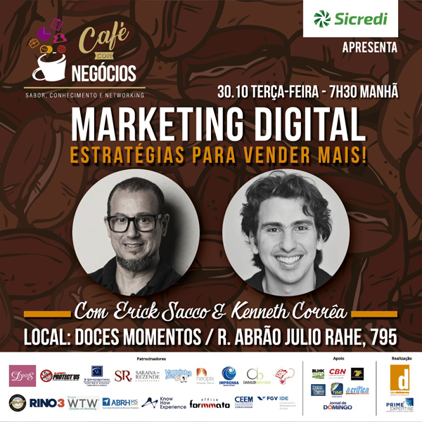 A 18ª edição do Café com Negócios acontece na manhã desta terça-feira, dia 30 de outubro. Os palestrantes Erich Sacco e Kenneth Corrêa falarão sobre estratégias de marketing digital que os empresários podem fazer para vender ainda mais. O foco estará nas vendas de fim de ano.
