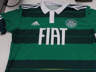 O modelo, que está circulando no Twitter e em listas de e-mails de palmeirenses, foi comprado em um shopping de São Paulo e tem grossas listras horizontais em dois tons de verde, além de pequenos filetes – um deles em verde limão, cor do segundo uniforme do time nesta temporada.
