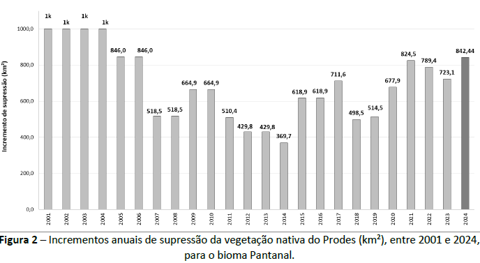 O Pantanal está entre os biomas brasileiros que registraram aumento do desmatamento em 2024, segundo Nota Técnica divulgada na sexta-feira (11) pelo Instituto Nacional de Pesquisas Espaciais (Inpe). Os dados fazem parte do Monitoramento Anual da Supressão de Vegetação Nativa (Prodes), responsável pelo monitoramento anual da supressão de vegetação nativa no país.