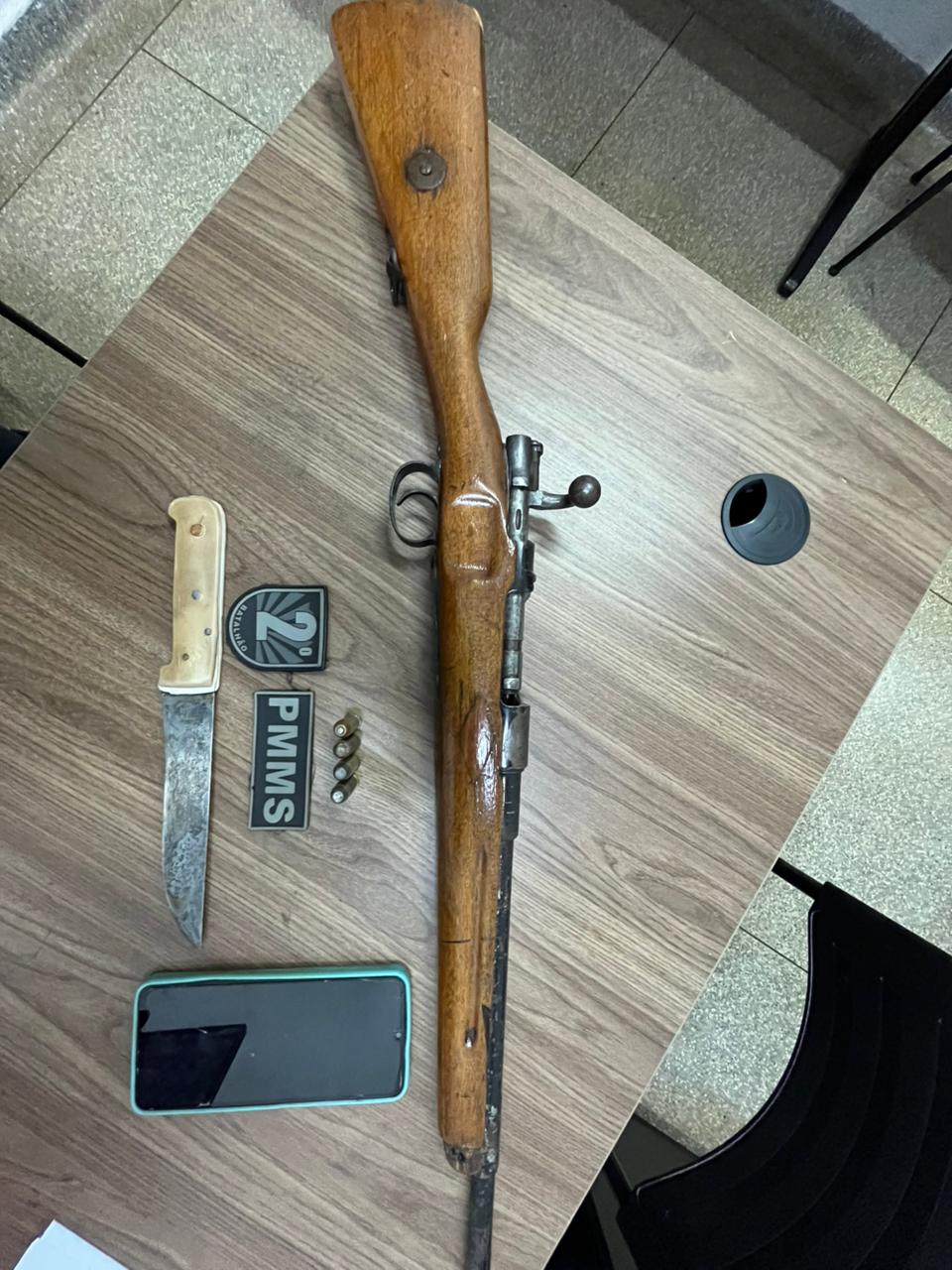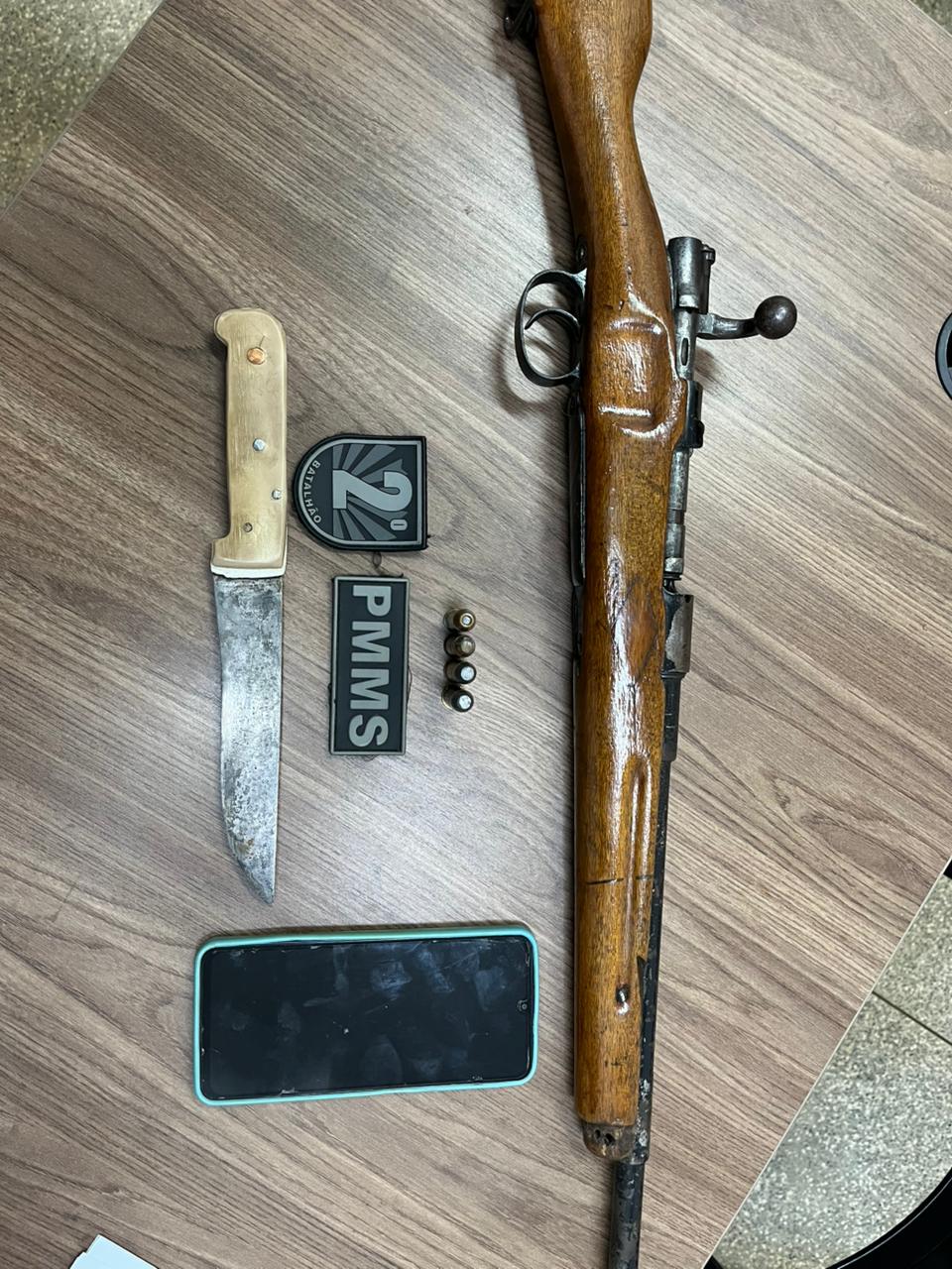A ação ocorreu por volta de 23h20, na rua Albano Tomé, quando a equipe foi acionada para atender uma denúncia envolvendo agressões e ameaças contra uma mulher, de 43 anos. No local, os militares encontraram o suspeito armado com uma espingarda calibre ponto 44, acompanhada de quatro munições intactas, além de uma faca de cozinha, utilizada para intimidar a vítima.