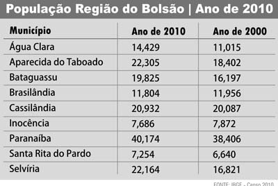 Destaque para Paranaíba, tradicional cidade da região, que saiu de 38.406 habitantes para 40.174. Aparecida do Taboado aparece em seguida com crescimento de 18.402 habitantes para 22.305. O mesmo aconteceu com Baraguassu; que aumentou de 16.197 para 19.825, e Selviria, cuja população pulou de 16.821 para 22.164.