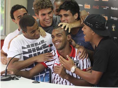 Enquanto conversava com os jornalistas, Richarlyson foi supreendido por alguns companheiros, que invadiram a sala de imprensa para homenageá-lo.