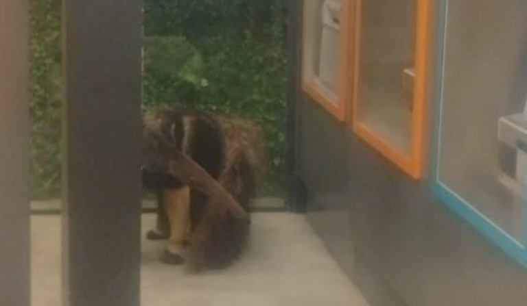 Um tamanduá-bandeira adulto foi capturado pela Polícia Militar Ambiental (PMA) na manhã de sexta-feira (30) após ser encontrado dentro de uma agência de um banco, na avenida Mato Grosso, em Campo Grande.