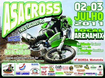 Três Lagoas de prepara para sediar o 1º motocross regional “Asacross”, nos dias 2 e 3 de junho, no espaço Arenamix. O evento é organizado pela Associação dos Amigos Três-lagoenses de Motocross (Asatrem) e serão distribuídos R$ 6,4 mil em prêmios, contemplando as 11 baterias programadas pelos organizadores.
