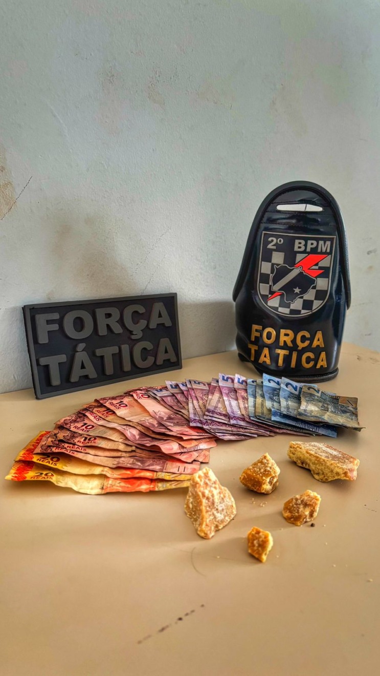 Durante entrevista, uma das abordadas relatou espontaneamente que realizava a comercialização de drogas em companhia da outra mulher, afirmando ainda que o entorpecente estaria guardado em outro apartamento do mesmo condomínio. A equipe foi até o endereço indicado e localizou cerca de 69,9 gramas de substância semelhante a crack, além de R$ 202 em dinheiro.