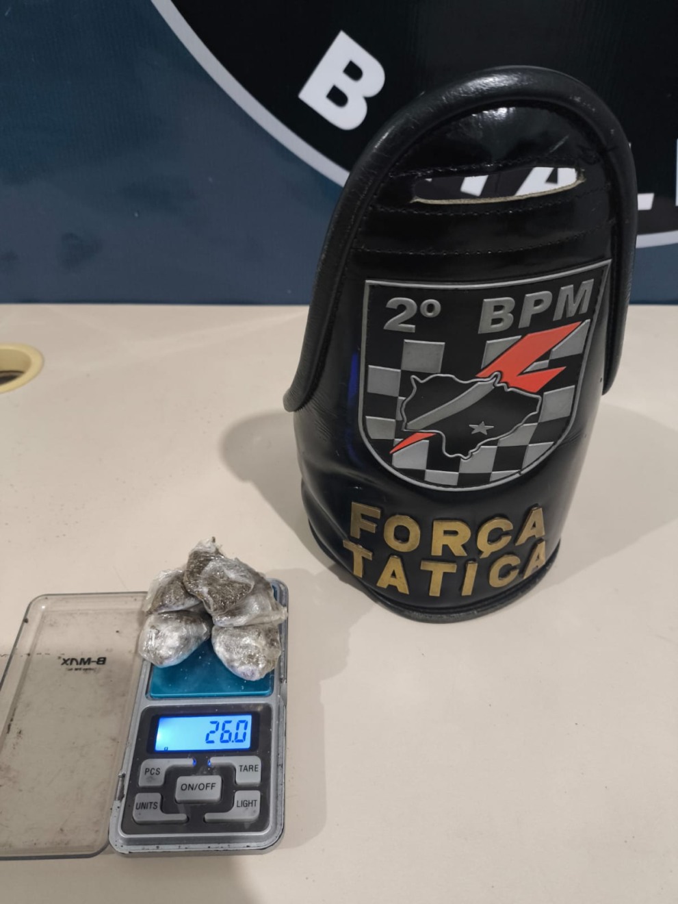 A prisão ocorreu por volta das 17h40, durante rondas da equipe da Força Tática no Residencial Novo Oeste. No Condomínio Ema, os policiais visualizaram um ciclista em frente a um bar, local já conhecido por denúncias relacionadas ao comércio de entorpecentes. Ao perceber a aproximação da viatura, o indivíduo tentou fugir a pé, mas foi alcançado e detido.