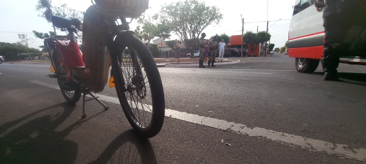 Uma mulher ficou ferida após colidir a bicicleta elétrica que pilotava em um carro na manhã desta quinta-feira (2), na avenida Doutor Eloy Chaves, no bairro Vila Nova, em Três Lagoas.